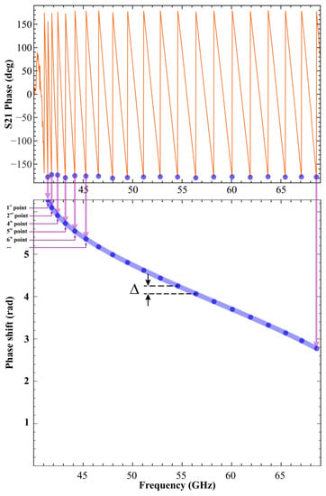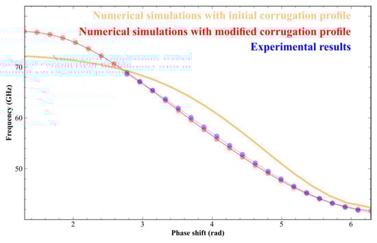In the next step, we retrieved dispersion of the fabricated structure using measured phase data of the transmitted signal. The method of reconstruction is illustrated in Figure 8 (see also [,]). First, we plot the dependency of the phase of the transmitted signal versus frequency. Then, we select all the frequency points where we observe the phase jumps from −π to π. The first point of the phase jump has a phase shift on the dispersion plot that is equal to 2π. The phase shift of the second point of the phase jump is 2π − Δ, where , M is the number of the pitches of the interaction structure. The number of pitches in the fabricated structure is 34, which is the sum of the 10 regular pitches and 2 × 12 tapered pitches (see Figure 2a). Consequently, the phase shift of the third point of the phase jump will be 2π – 2 × Δ and accordingly 2π − (n − 1) × Δ for the n-th point. A comparison of the dispersion characteristic retrieved from the experimental data and from the numerical simulation is presented in Figure 9. Table 2 also includes a comprehensive comparison of the dispersion parameters derived from numerical simulations and determined from experimental findings. The differences between experimentally acquired and numerically derived data are calculated as well. The difference was revealed to be less than 0.9%. The last demonstrates the good agreement between experimental observations and numerical modeling.