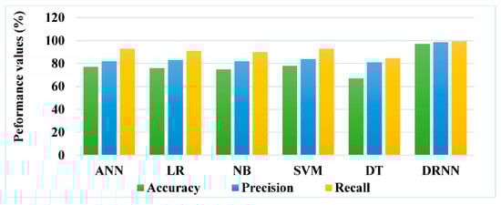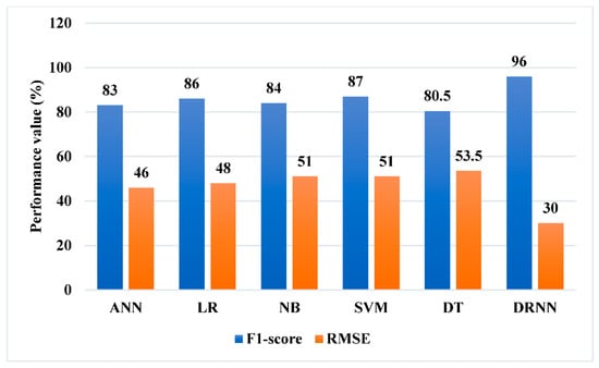 TP represents the true positives, TN represents the true negatives, FP represents the false positives, and FN represents the false negatives. Table 1 and Figure 6 illustrate the accuracy, precision, and recall measurements of both existing and proposed classification systems. Table 2 and Figure 7 present the RMSE and F1-score of known and proposed classification approaches, such as ANN, LR, NB, SVM, and DT. Typically, these criteria affect the effectiveness of a prediction system, with the number of features and attributes utilized to train the data model having a major effect on the accuracy of working pregnant women stress prediction. The results prove that the suggested DRNN model is far better than the other algorithms in terms of accuracy, precision, recall, F1-score, and RMSE values. It demonstrates that the DRNN-based technique provided for predicting working pregnant women’s stress beats other techniques in terms of overall performance.