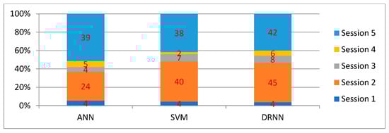Furthermore, the prediction performance of the existing SVM, ANN, and proposed DRNN techniques is assessed using a variety of working pregnant women sessions, as shown in Figure 8 and Table 3. Based on these findings, it has been determined that the proposed DRNN technique outperforms existing techniques. This is because, in the proposed system, working pregnant women’s stress is predicted before and after work, as well as their participation in all of the official events. Additionally, working pregnant women feedback has been collected and updated with the dataset, in which the most appropriate features for improving classification performance have been extracted.
