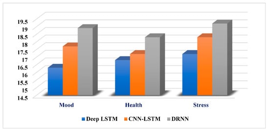 The prediction results of both existing and proposed deep-learning models for the categories of mood, health, and stress factors are shown in Table 4 and Figure 9. The results show that by training the model with the optimal set of features, the proposed DRNN-based deep learning accurately predicts the mood of working pregnant women. It aids in improving the system performance as well as accurate stress prediction in working pregnant women. The proposed model will assist to predict the stress level of women and can assist them from the side effects of stress; the accuracy of the model is better than that of the previous model, and the same is also showed by the table and figure given below.