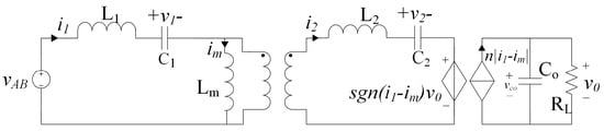 Replacing the full-bridge inverter circuit with a square-wave voltage of amplitude , and equating the rectifier circuit to a combination of a controlled voltage source and a controlled current source.Therefore, the equivalent circuit of the bidirectional full-bridge CLLC resonant converter shown in Figure 3.