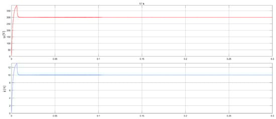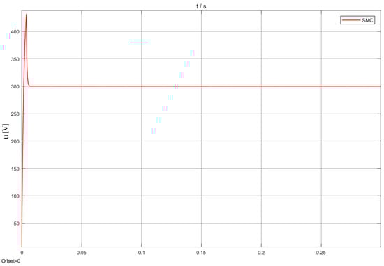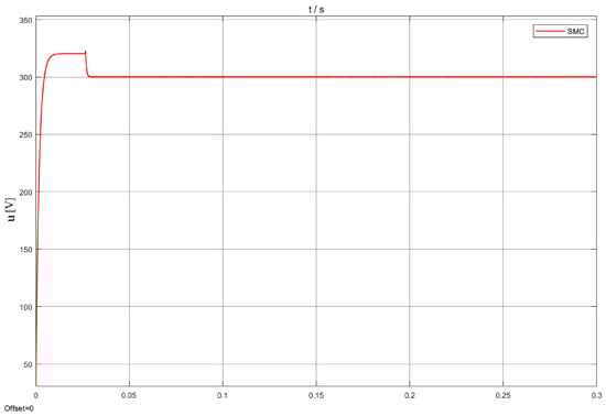 Figure 10 and Figure 11 show the output voltage response curves when the input voltage is adjusted to 270 V and 400 V, respectively. At 400 V in particular, the output voltage stabilizes at 300 V after only about 1 ms, but the overshoot is relatively large at this point. Using the SMC, this converter is able to regulate a wide range of input voltages from 270–400 V. Figure 10 and Figure 11 also show that the ripple in the output voltage is very small and the response is fast.