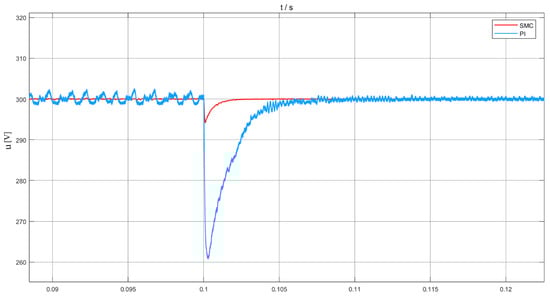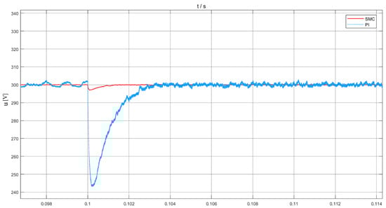 Figure 13 shows the corresponding output voltage curves for SMC and PID control when the output load changes abruptly from full load to half load at 0.1 s. It can be seen that the SMC returns to a steady state again after about 1 ms of regulation, whereas the PID control takes about 3 ms to stabilize, so the SMC is more capable of dynamic regulation. Furthermore, the voltage dip of the SMC is much smaller than the voltage dip of the PID control during regulation, as well as the ripple of the output voltage, which helps to improve the converter’s stability and efficiency.