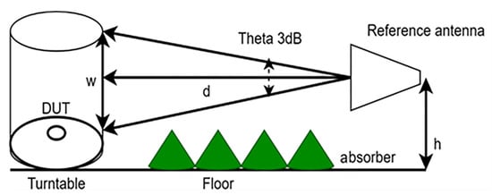 It is worth mentioning the minimum 3 dB beamwidth of the proposed antenna is agreeable with the standard limits of the classical PLPDA in CISPR 16.1.2, as shown in Table 7. The minimum dimension of w can be calculated using Equation (18), where w is the minimum dimension of the line tangent to the DUT formed by the minimum 3 dB beamwidth (), as shown in Figure 1.