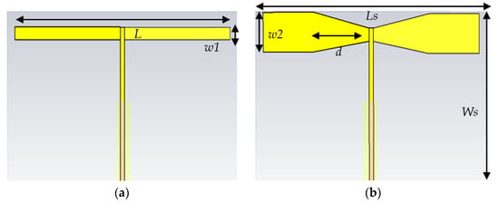 This section focuses on the benefits of using a biconical dipole instead of a classical one. The size reduction and bandwidth enhancement benefits have been demonstrated by designing and simulating two dipoles—conventional dipole and biconical dipole—using CST Microwave studio with a discrete feeding port, as shown in Figure 2. Furthermore, both dipoles have a length of (L = 170 mm) and widths (w1 = 6 mm and w2 = 16 mm, respectively). The proposed structures are based on an FR-4 substrate with a size of Ls = 180 mm and Ws = 160 mm.