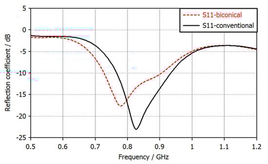 The spacing between adjacency dipoles becomes smaller as it approaches the high-frequency dipoles. In contrast, low frequencies at the longest dipoles have higher bandwidth than the lowest length dipoles, which have sharp bands. Therefore, the spacing should be obtaining small to make these sharp bands close to each other, and consequently, it leads to achieving a wide band. Figure 7 shows the reflection coefficient of the conventional and proposed designs. The biconical dipoles have significantly impacted the impedance bandwidth (from 0.5 GHz to 5.5 GHz) compared with linear dipoles (from 0.7 GHz to 3.3 GHz). Hence, the biconical dipoles have better performances than the conventional dipoles.