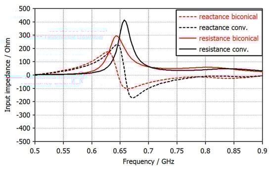 Input impedance versus frequency for conventional dipole and biconical dipole.