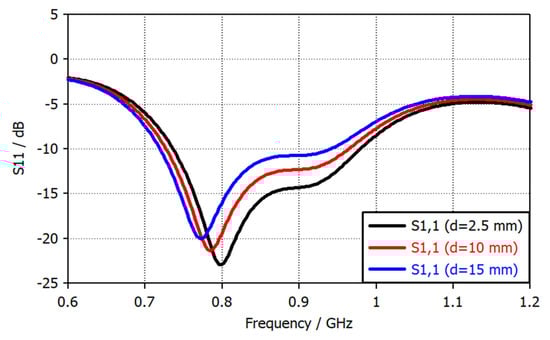 Finally, the length of the dipoles, the width of the dipoles, and the spacing between dipoles should be divided by the square root of the effective dielectric constant, , , and respectively [32]. The effective dielectric constant is described by Equation (12).