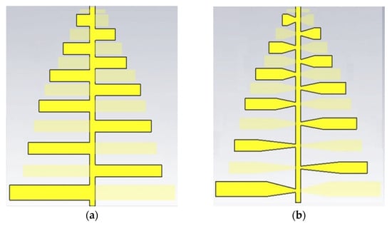 The feeding techniques play a vital role in designing the log-periodic dipole antenna array. The typical feeding method consists of two non-radiated microstrip lines attached to each substrate’s side to connect the successive dipoles. There will be a 180° phase difference between every two consecutive dipoles, ensuring the energy will radiate only from the exciting dipole. At the same time, there is no contribution by the coupling from the next dipole, which has a reverse direction. The width of each microstrip feeding line can be calculated using Equation (13) [40].
