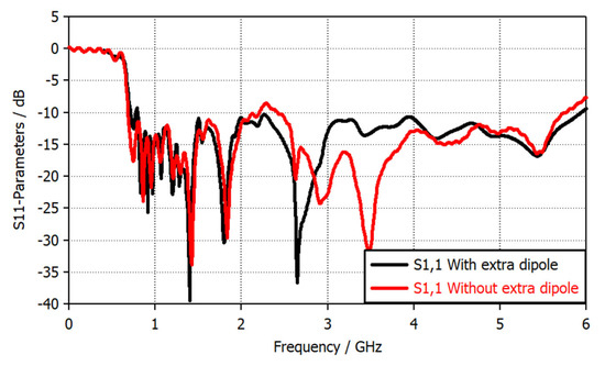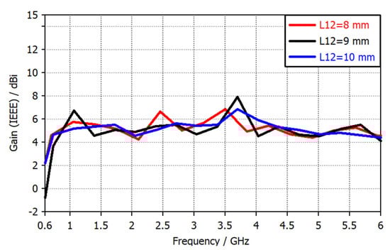 Even with this promising result of the reflection coefficient of biconical dipoles array antenna, the voltage standing wave ratio still does not satisfy the condition VSWR < 2, especially at 2.4 GHz, in which the reflection coefficient is approximate −9 dB. Hence, an extra dipole (conventional one) is designed and optimized to eliminate this reflection, and the result is shown in Figure 8. This additional dipole was inserted between the input port and the biconical element number 11 [27]. It is clear that through the whole frequency band from 0.5 GHz to 6 GHz, the VSWR < 2, and the reflection coefficient value is now below −10 dB. Furthermore, it was found that the changing of the extra additive dipole length has also significantly affected the gain values. Figure 9 presents the gain variation with different lengths of this extra dipole. The length L12 = 10 mm reflects the lowest gain fluctuations, which is necessary to achieve a good antenna factor result with low uncertainty. However, the gain could be flatter with increasing the length of the additive dipole, but it will corrupt the impedance matching since there is a trade-off process. Therefore, L12 = 10 mm is the optimum value for both the s-parameter and the gain.