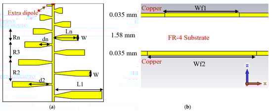 Figure 10a shows the optimized geometrical shape of the design, while Table 1 illustrates the optimum values of each dipole element’s parameter. The width of the dipole is set at the value of 10 mm except for the first dipole‘s width (W1 = 13 mm) and the extra dipole’s width (W12 = 5 mm). On the other hand, parameter (d) plays a vital role in having broadband impedance matching since it is the central part of modifying every dipole’s biconical shape, as shown previously in Figure 5. Finally, an optimization process took place on the overall dimensions to obtain better performances using Microwave CST Studio’s facilities [41]. The utilized structure is epoxy FR-4 relative permittivity , and loss tangent of = 0.025. Figure 10b depicts the cross-section area of the proposed structure.