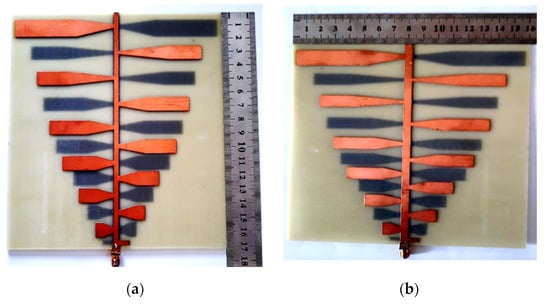 Moreover, an LPDA antenna is called frequency-independent when the ratio of higher frequency to the lower frequency is more than ten times, where the impedance and radiation characteristics remain constant as a function of frequency. The lower operating frequency of the LPDA determines its size and, consequently, the length of the most extended dipole. Since the aimed wide operation frequency band starts from 500 MHz, the LPDA length will be considerably large. To overcome this LPDA size limitation, the printed log-periodic dipole array (PLPDA) antenna has been presented recently utilizing printed circuit board (PCB) technology that offers good specifications such as low cost, low profile, small size, and easy fabrication [23]. In PLPDA, all the parameters of the conventional LPDA antenna are divided by the square root of the effective dielectric substrate ().