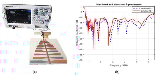 The reflection coefficient of the proposed design has been measured using the RIGOL DSA875 Spectrum Analyzer (9 kHz–7.5 GHz) with directional couplers (RIGOL VB 1032 and RIGOL VB 2032), as shown in Figure 12a. These two directional couplers are utilized simultaneously to cover the band up to 8 GHz (RIGOL VB 1032 (0.1–3.2 GHz) and RIGOL VB 2032 (2 to 8 GHz)). Figure 12b shows the simulated and measured return losses. It can be seen that the design offers a wide impedance bandwidth of 0.55–6 GHz in both simulation and measurement results.