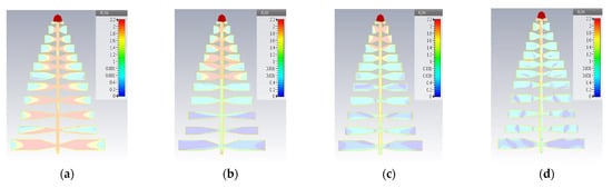 Surface current distribution at: (a) 0.7 GHz; (b) 1.2 GHz; (c) 2.2 GHz; (d) 4.5 GHz.