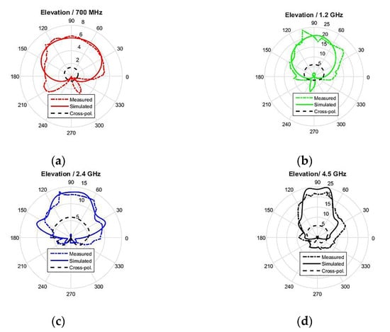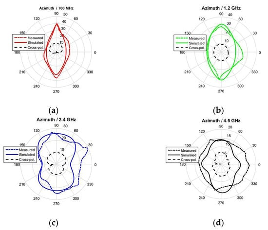 H-plane radiation pattern at: (a) 0.7 GHz; (b) 1.2 GHz; (c) 2.2 GHz; (d) 4.5 GHz.