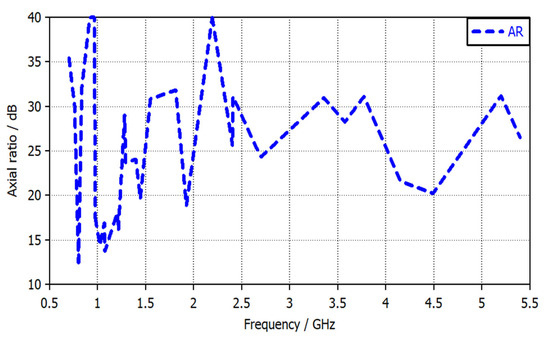 The term axial ratio (AR) demonstrates the type of polarization, whether circular, elliptical, or linear. The axial ratio of the circular polarization pounces between 0 and 3 dB, the AR of elliptical polarization is higher than 3 dB, and finally, the linear polarization will stand for AR going to infinity (theoretically). In fact, there is no practical/industrial norm for differentiating elliptically polarized antenna from linearly polarized antenna in terms of the axial ratio. Authors in [44] claimed the proposed design exhibits linear polarization with AR > 10 dB in planes (φ = 0, θ = 0) and (φ = 90, θ = 0) since linear polarization may be viewed as a special case of elliptical polarization. The phase difference between the two gain components was close to zero in the direction (θ = 0), indicating linear polarization raised from the radiation pattern properties [45]. The proposed structure offered linear polarization with more than 20 dB AR except for some frequencies, as shown in Figure 17.