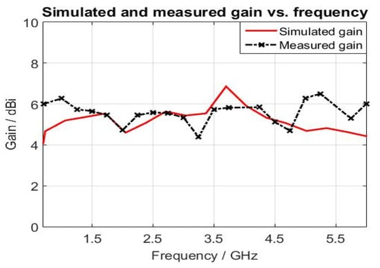 The simulated and measured realized gain (dBi) are depicted in Figure 18. Relatively small fluctuations in gain values (4.6–7) dBi reflect good behavior in antenna factor values (24–41) dBm−1. Figure 19 shows the antenna factor versus frequency, while the antenna factor values are listed numerically for each frequency band in Table 2. It can be seen that the gain and, consequently, the antenna factor are in line with the typical values of a standard EMC antenna [46].