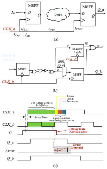 Moreover, the propagation delay becomes more unpredictable and affects the performance more severely under NTV, resulting from unstable PVT variations [26]. A small change in the supply voltage will cause a large change in the delay. Furthermore, with the continuous process technology scaling, a PVT-induced delay increasingly exacerbates the timing conditions of synchronous circuits on both the clock signals and data paths [23]. Thus, the accuracy of logic circuits significantly reduces, resulting in the propagation of intolerable timing errors. Timing guard band is reserved in conventional designs to avoid PVT-induced timing errors, as the CLK_a shows in Figure 2c. However, this conventional method cannot overcome the problem of considerable energy wasting caused by the reserved voltage and timing margins.