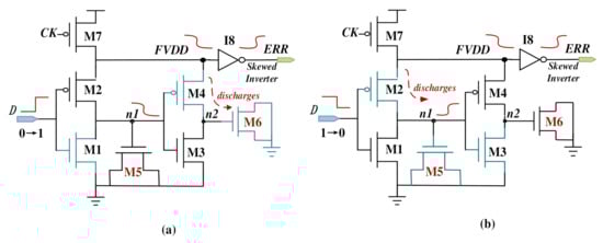 The timing error detection principle of the NTSD, under two input data transition scenarios, is explained in detail below. As shown in Figure 3a and Table 1, when D is logic “0”, M2 and M3 are switched on. So, the FVDD node will be in the logic-high state, the same as the internal node denoted by n1. The internal node denoted by n2 will stay in logic-low under the normal transmission without a timing error. Once D transitions from logic “0” to “1”, M2 is abruptly switched off, n1 is discharged to logic-low state and M4 is switched on. However, the floating node FVDD will be discharged to logic-low because n2 is discharged by M6 to stay in logic-low for a short time.