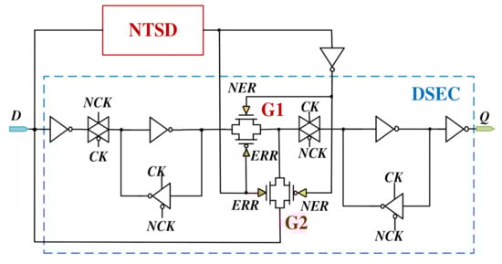 The DSEC circuit based on the structure of the conventional TGFF [28] is composed of two latches and two transmission gates denoted by G1 and G2, as shown in Figure 4. G1 and G2 are driven by error signals from the NTSD to select the valid inputs. Under the nominal timing conditions, when the system circuits work without timing errors, G1 stays switched on and G2 stays switched off.