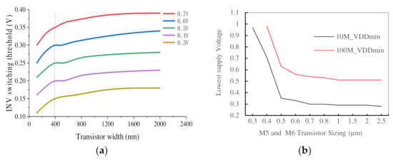 To ensure the inverter I8 to capture a subtle voltage dropping at the floating node FVDD, I8 requires skewed transistor sizing to have a sufficiently high logic threshold voltage. We investigate the impact of inverse narrow PMOS width effect [31] on the threshold voltage at different supply voltages with SMIC 40 nm HVT process technology. The results are shown in Figure 5a, indicating that the variation of threshold voltage increases as the supply voltage decreases. The threshold voltage of the inverter remains nearly flat for transistor width larger than 400 nm but decreases quickly as the transistor width approaches the minimum width (W = 120 nm). To minimize the area overhead, we set the width of the PMOS transistor in the skewed inverter I8 as 400 nm.