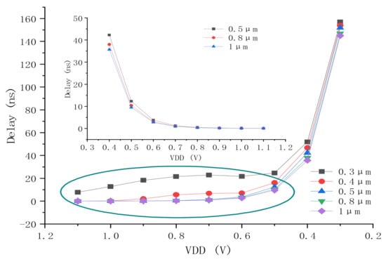 Figure 6 indicates that the delay of timing detection decreases at the supply voltages of 1.1–0.3 V as the width of transistors M5 and M6 increases. The change in the delay of the NTSD is insignificant when the width of transistors is larger than 500 nm. As the supply voltage increases from the standard voltage 1.1 V to the NTV, the delay of the NTSD increases much more quickly than expected due to drain current increasing.