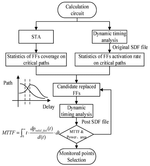 Considering the variability in noncritical paths, we introduce the mean-time-to-failure (MTTF) constraint [32] to propose an MTFF-aware hybrid selection (MAHS) method. This method simultaneously considers the coverage and activation rates of all FFs instead of only circuit paths. The constraints of the MTTF and the circuit cost in area (the number of the monitored points) are also considered to select the final monitored registers in application circuits.