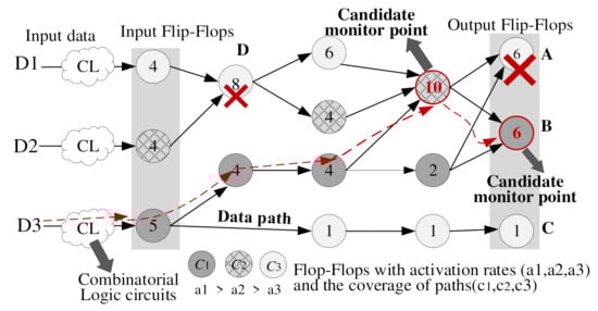 As shown in Figure 8, the node B with the same path coverage as node A is selected as the candidate FF, because it has a higher activation rate over the node A. The node D with a smaller activation rate will not be chosen, although its path coverage rate is larger than 60%. The coverage-rate-based and activation-rate-based selections are iteratively performed to obtain all candidate FFs to be replaced. In the processing element (PE) array circuits of baseline CNN accelerator, we select 28 FFs covering 874 paths and 59 FFs with 60% activation rates among a total of 831 FFs on 874 paths. Finally, the proposed MAHS method chooses 39 FFs, thus reducing 25 FFs with 3.5% area and 2.17% power savings, compared with the common method choosing endpoints of critical paths with a timing slack smaller than 10% of the clock period.