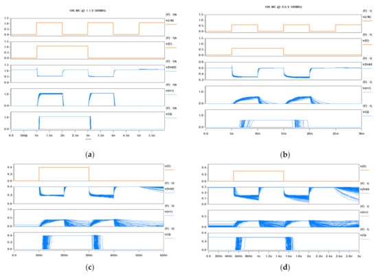 The results of 10 K MC simulations: (a) at 1.1 V, 500 MHz; (b) at 0.6 V, 100 MHz; (c) at 0.4 V, 5 MHz; (d) at 0.3 V, 1 MHz.