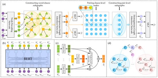 | Input : The heterogeneous graph , , The initial feature of clause node , The initial feature of word node . Output: The clause node representations , The pair node representations . for word-clause subgraph do Project feature space ; for word node do Project feature space ; Calculate the node-level weight coefficient ; Update clause node feature ; for pair-level subgraph do for pair node do Initialize the node representation ; Project feature space ; for meta-path do for neighboring node do Calculate the node-level weight coefficient ; Aggregate node feature ; Calculate the weight coefficient of meta-path ; Update pair node feature ; Calculate the total loss ; Back propagation and update parameters; return , . |