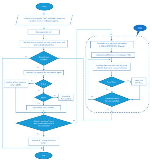 Initialize the population for GWO and WAO Calculate the fitness of each search agent X* is the best search member While (it < MaxIter) For every search agent do Calculate a, A, C, L, and p. if (p < 0.5) then if (A < 1)then update the position of the current search member by else if (A ≥ 1) then Select a random search agent (Xrnd). Update the current search agent by end if else if (p ≥ 0.5) then update the position of the present search member by using Equations (1) and (2). end if end for Find the fitness of all search members If (Objective function of current agent > Objective function of previous position) then Initialize the parameters of the HS HMCR, PAR and etc Initialize harmony memory (HM) Evaluate all solutions using the fitness function while Termination criteria do new solution = 0 if rand HMCR then Memory consideration if rand < PAR then Pitch adjustment end if else Random consideration end if Evaluate the fitness function of the new solution Replaces the worst solution in HM by the new solution end while return to while loop else Update it = it+1 end while return |