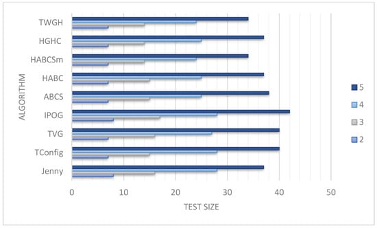 Researchers calculated each segment’s average and ideal test suite size by repeating the TWGH run 30 times for comparative purposes. The computer had an Intel(R) Core (TM) i7-10750H CPU running at 2.60 GHz, 2.59 GHz, and 24 GB of RAM. The operating system used was Windows 11 Home. TWGH was implemented in PYTHON3. Tables are used to present the collected data (see Table 1, Table 2, Table 3, Table 4, Table 5 and Table 6). In addition, Figure 2, Figure 3, Figure 4, Figure 5 and Figure 6 represent results for CA (N; t, v7) with 2 ≤ t ≤ 6 and 2 ≤ v ≤ 5.