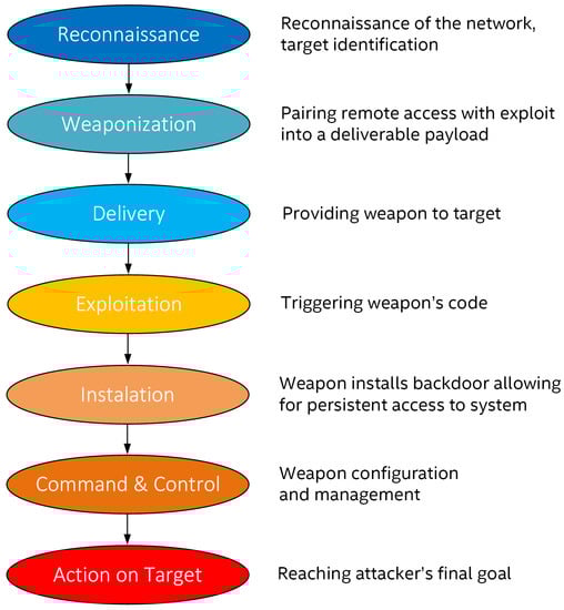 In 2011, Lockheed Martin Corporation proposed the Intrusion Kill Chain Model (Figure 1), which distinguishes particular phases of the attack [8]. The model assumes that every malicious campaign begins at the reconnaissance stage. Later stages are payload delivery and installation, which leads to privilege escalation via found vulnerabilities and lateral movement inside target network. Finally, when ready, the attacker performs action on a target and exfiltrates. This is an example of the so-called linear kill chain. More talk about intrusion kill chains and their types can be found in [4]. Effective defense at early points would not allow the attacker to cause any damage (no material, financial, data, or reputation loss) even if potential zero-day exploits for the target system are available [9].