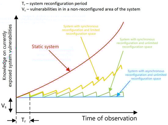 Passive reconnaissance is the stealthy observation of the system for a specified period to detect a vulnerability (which is equivalent to attack surface detection). A static system attacker’s knowledge of the system, and its security vulnerabilities, increases over time. Figure 2 compares this case with three different MTD strategies. When the system is reconfigured periodically in a finite space, the observer’s level of knowledge grows slower. After each reconfiguration, the attacker’s knowledge of the current status of the system drops, but eventually overall knowledge rises. Increasing the space for reconfiguration, combined with pseudo-random timing, hardens the system even more. From the security point of view, ideal configuration uses asynchronous reconfiguration in an unlimited reconfiguration space. Unfortunately, due to technical limitations, this case is not feasible in practice.