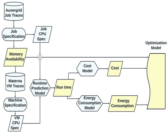 Our optimization model’s inputs consist of the weight preferences for each decision variable and the decision matrix reflecting the Materna traces dataset’s data. The values for the decision matrix are queried from the resource table. Given a task’s properties, the decision matrix is initialized with the resources that fulfill the minimal criterion for memory availability. The decision matrix has dimensions of , where n represents the total number of decision variables and m represents the total number of discovered VMs from the Materna dataset.