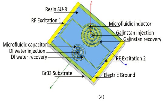 Each of these technologies has its own specificities, so the choice of using one or the other depends on the actual need of the system in which the filters will be integrated. For non-demanding specifications in terms of power handling and insertion losses, planar technology offers a very good cost/performance compromise. It is in this scenario that we have positioned ourselves throughout this work in order to evaluate a new tuning feature for variable microwave filters. Indeed, in this work, we associate two microfluidic tunable devices in the same wafer: an inductor [17,18,19] and a capacitor [20,21]. The advantage of these tunable devices lies in their ability to operate at different frequency bands using the simplest possible structure. Our study allows us to catch the resonant phenomena in response to frequency variation and thus understand the behavior of the filter. Furthermore, we analyzed the liquid displacement effect of both conductive and dielectric liquids on the frequency response of the microwave structure.
