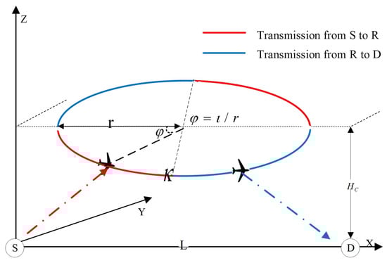 As shown in Figure 3, in order to solve the problem that the mountain blocks the LoS communication, we assume that the UAV follows a simple circular trajectory with altitude and speed v [18]. In practice, should be higher than the height of mountain to avoid collision, but only need to satisfy the condition of LoS. Similar to Lemma 1, we suppose the flight arc length is , when , the UAV R receives the data from S, and then sends the data to D.