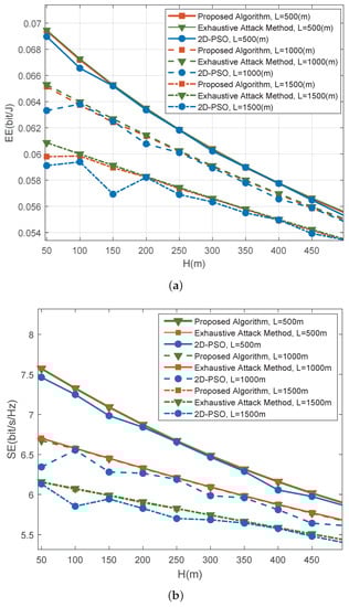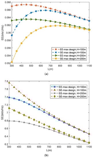 Figure 7a shows the EE of the UAV-enabled mobile relaying system with different designs. It is noted that for small values of L, there exists a big gap between the EE max design and the SE max design. Furthermore, the gap between the two designs reduces with the value of L. Figure 7b shows the SE of the UAV-enabled mobile relaying system with different designs. It can be seen that there is a significant decrease in SE with increasing L for both two designs. Intuitively, according to Figure 6b, the optimal radius gradually increases with L; as a result, the signal experiences more attenuation when L increases.