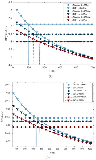 For ease of presentation, in Figure 5a,b, the intersection of the SLF trajectory and the circular trajectory under the same L are denoted as A and B, respectively. As shown in Figure 5, B will be larger than A with the same L, which means that the energy efficiency advantage of the SLF trajectory is greater when the communication distance is reduced.