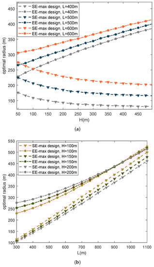 In Figure 6a, as increases, the gap between optimal radius for SE and EE max design increases. The reason is that the SE decreases with the value of H, and the EE of UAV will be mainly influenced by energy consumption for sufficiently large H. Thus, only considering one performance metric (EE or SE) will sacrifice the other one. Figure 6b shows the optimal radius versus L for different designs. Firstly, it can be seen that, for all values of L, the optimal radius for the SE max design satisfies the constraint , and the optimal radius for the EE max design is in accordance with Lemma 2, i.e., . Next, it is also observed that the gap between and decreases with the value of L. The reason is that the optimal radius of the SE max design decreases with L. On the other hand, smaller trajectory radius means more propulsion power required for the UAV relay. Thus, the small optimal radius of the SE max design is energy inefficient.