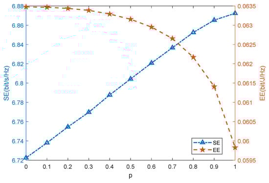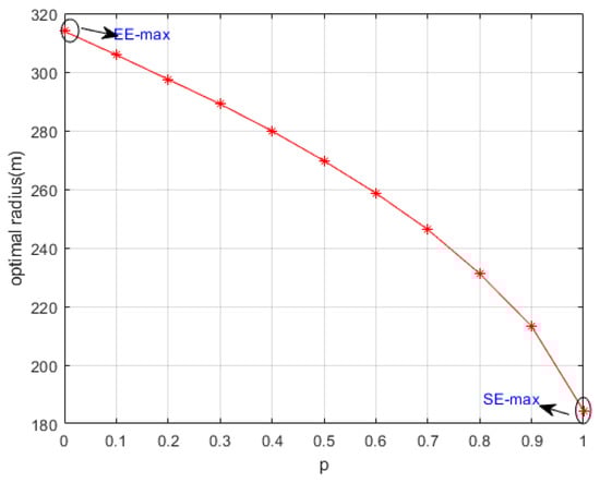 Next, we studied the SE-EE trade-off for UAV-enabled mobile relaying systems. Figure 8 shows the optimal circular trajectory radius under different values of p when H = 200 m. It is shown that there exists a trade-off between the achievable SE and EE in the UAV-enabled mobile relaying system, i.e., in practical applications, we can balance the contradiction between throughput and limited energy of the UAV.