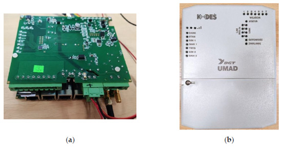 For this reason, in the KODEŚ device, many interfaces are provided. Some of them can support a connection in different technologies e.g., ISM, Serial and WWAN. The data concentrator has to periodically analyze the state of all provided interfaces to decide which of them is the most suitable to send user data. The authors of this paper are mostly interested in WWAN interfaces, that support all fully functional cellular networks. As for purpose of machine-to-machine communication in a deep indoor environment, NB-IoT technology was developed therefore, the WWAN1 interface is intended to work in this technology. Whereas the WWAN2 may switch utilized technology between GSM, UMTS or LTE, depending on which one can realize transmission with the best quality for a specific application. Figure 2 shows the device in cover (b) and without cover (a). In Figure 2a can be seen two antenna ports, four Ethernet ports, digital input IO, two SIM card slots and a power supply connection.