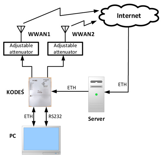 - Błaszkiewicz, O.; Burczyk, R.; Czapiewska, A.; Gajewska, M.; Gajewski, S.; Marczak, A.; Miszewski, M.; Sadowski, J.; Stefański, J. Laboratory stand for automatic analysis of the transmission quality of the KODEŚ concentrator with LTE, NB-IoT and ISM interfaces. Przegląd Telekomunikacyjny i Wiadomości Telekomunikacyjne 2021, 1, 10–19. [Google Scholar]