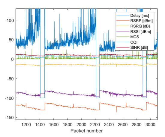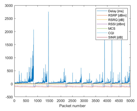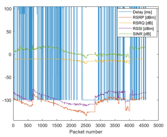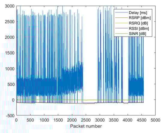 NB-IoT connection in KODEŚ is realized with the utilization of the Neoway N27 radio module. It reports the following signal parameters: RSRP, RSRQ, RSSI and SINR. For NB-IoT technology, 4500 measurements were done—UDP packets were sent from Server. Each packet had 100 bits in length. Simultaneously to each transmission attempt, all reported parameters by the radio module were saved. In Figure 4 are presented all realized measurements. A delay lower than 0 means that a particular packet was not received. It can be seen that delay values strongly fluctuated; however, the mean value was evidently increasing while the transmission quality deteriorates (adjustable attenuation increased). Due to the high values of the delay, Figure 4 is difficult to analyze. The scale on ordinate axes was changed and presented in Figure 5.