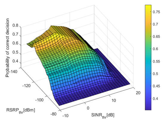 The probability of correct decision for different threshold values for RSRP and SINR, while the threshold for RSRQ was set to −20 dB and the threshold for RSSI, was set to −114 dB.