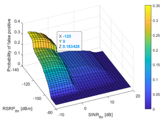 The probability of false positive decision for different threshold values for RSRP and SINR while the threshold for RSRQ was set to −20 dB and the threshold for RSSI was set to −114 dB.
