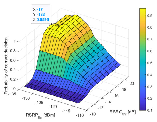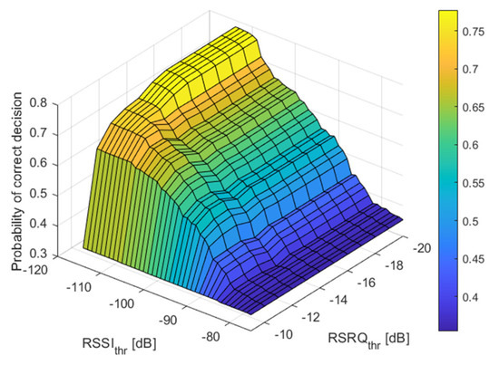 The probability of correct decision for different threshold values for RSRP and RSRQ while the threshold for RSSI was set to −100 dBm and the threshold for SINR was set to 0 dB.