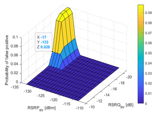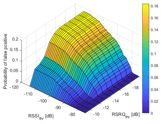 The probability of false positive decision for different threshold values for RSSI and RSRQ while the threshold for RSSI was set to −100 dBm and the threshold for SINR was set to 0 dB.