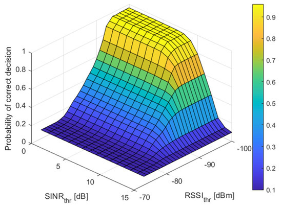 The probability of correct decision for different threshold values for RSSI and SINR while the threshold for RSRP was set to −133 dBm and the threshold for RSRQ was set to −17 dB.