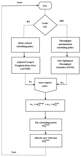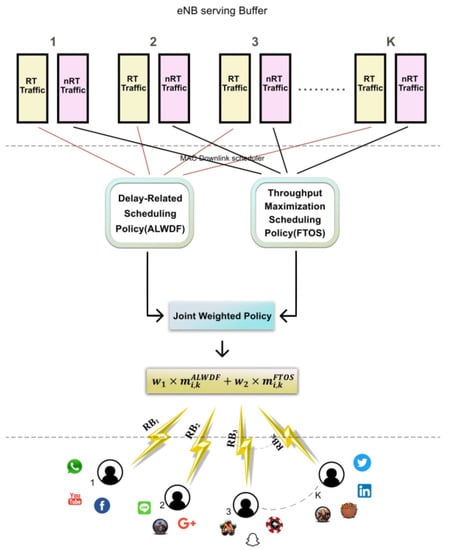To meet the demand of next-generation users to use mixed RT and nRT traffic simultaneously, we have applied a joint weighted policy developed by []. Therefore, two weighting elements, one for RT traffic and another for nRT traffic, were considered (ALWDF (delay-related policy or RT policy) and FTOS (throughput maximization policy or nRT policy)), as seen in Figure 1.